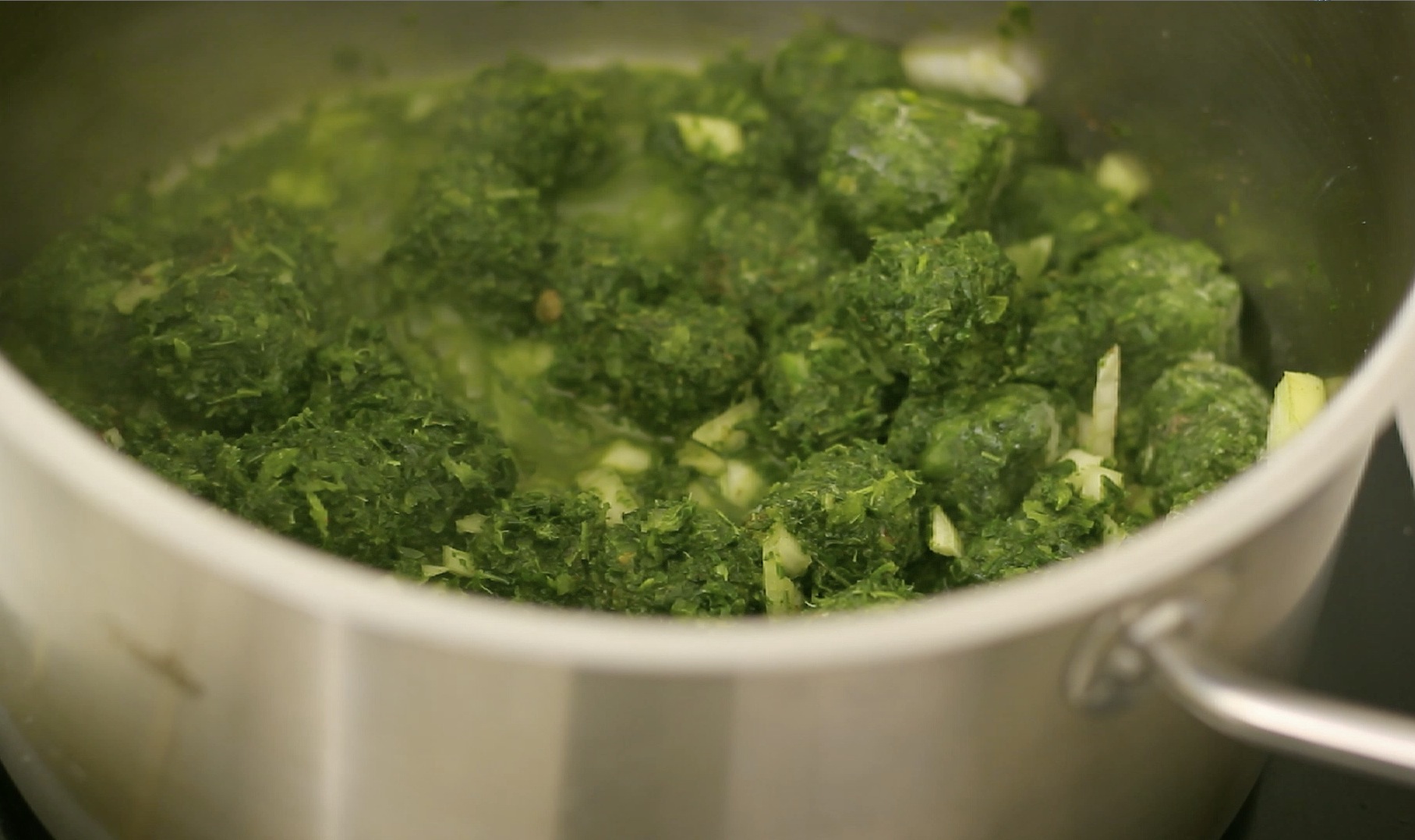 • Grünkohl zu den angedünsteten Zwiebeln in den Topf geben und garen lassen.
