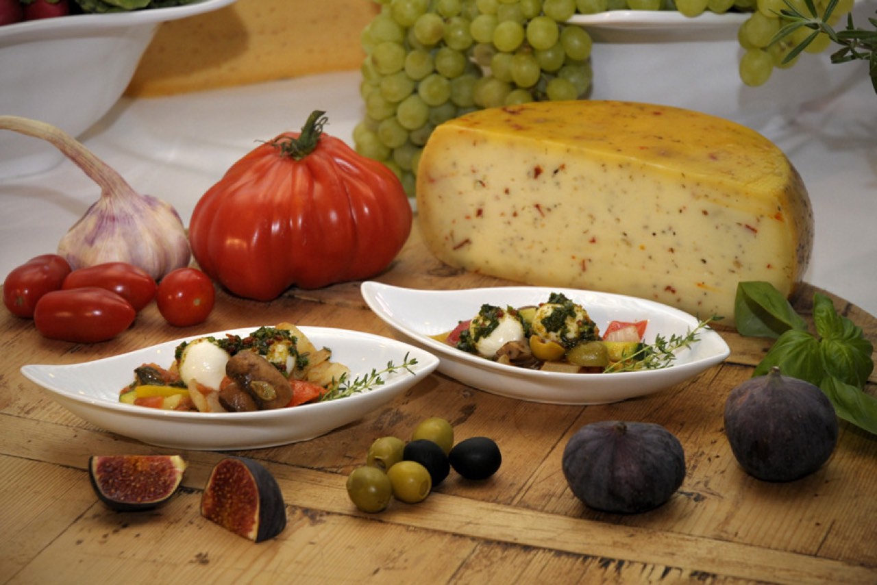 - Mediterranes Gemüse anrichten. Mit den marinierten Mozzarellakugeln und einem Basilikumblatt garnieren.