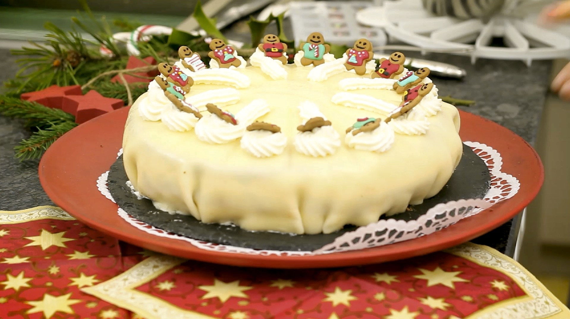 - Das fertige Marzipan ausrollen und mittig auf die Torte legen, sodass der ganzen Kuchen bedeckt ist. Die Haube etwas andrücken.