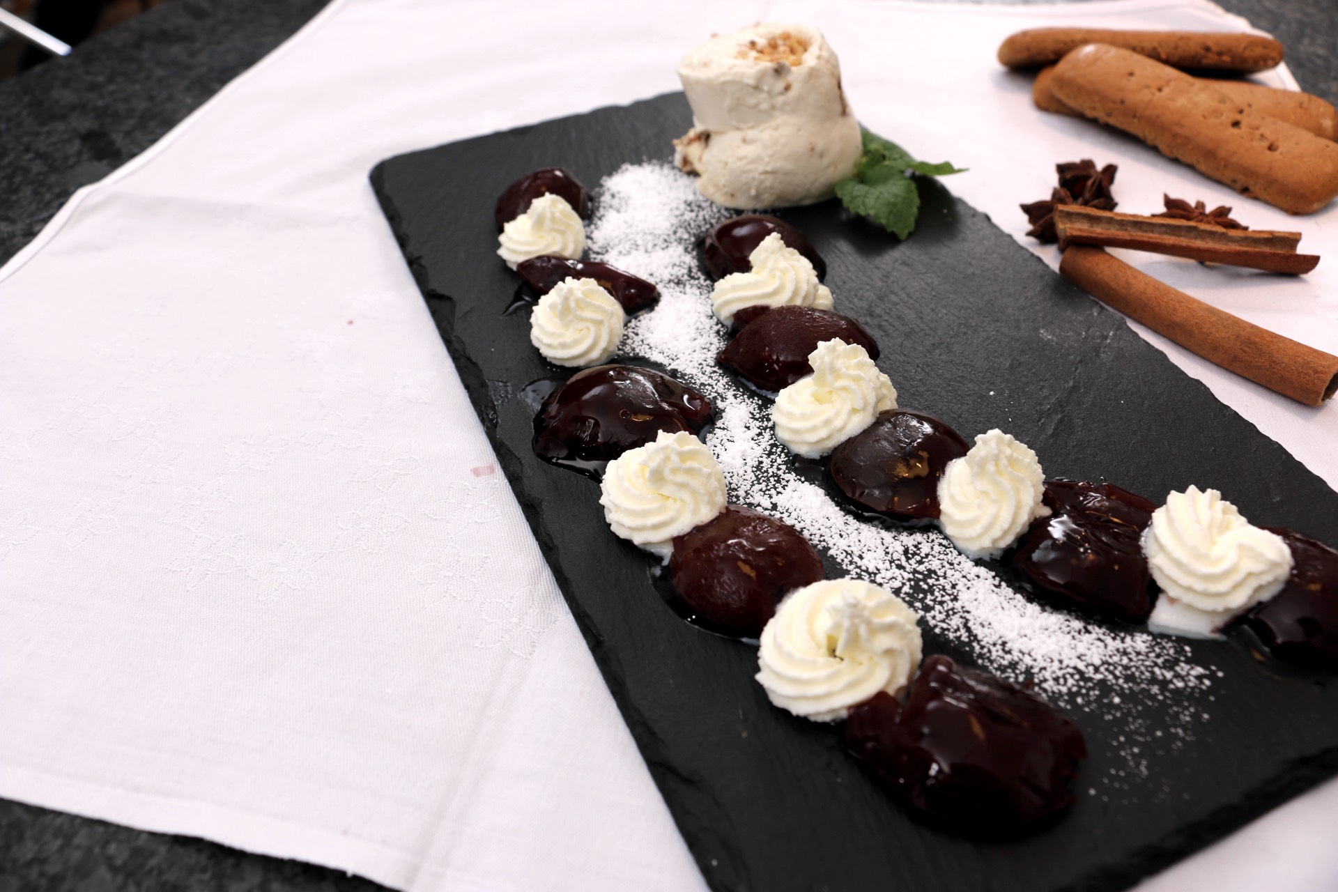 • Sahne mit Zucker und Vanillezucker steif schlagen und unter die Printen-Marzipanmasse heben.