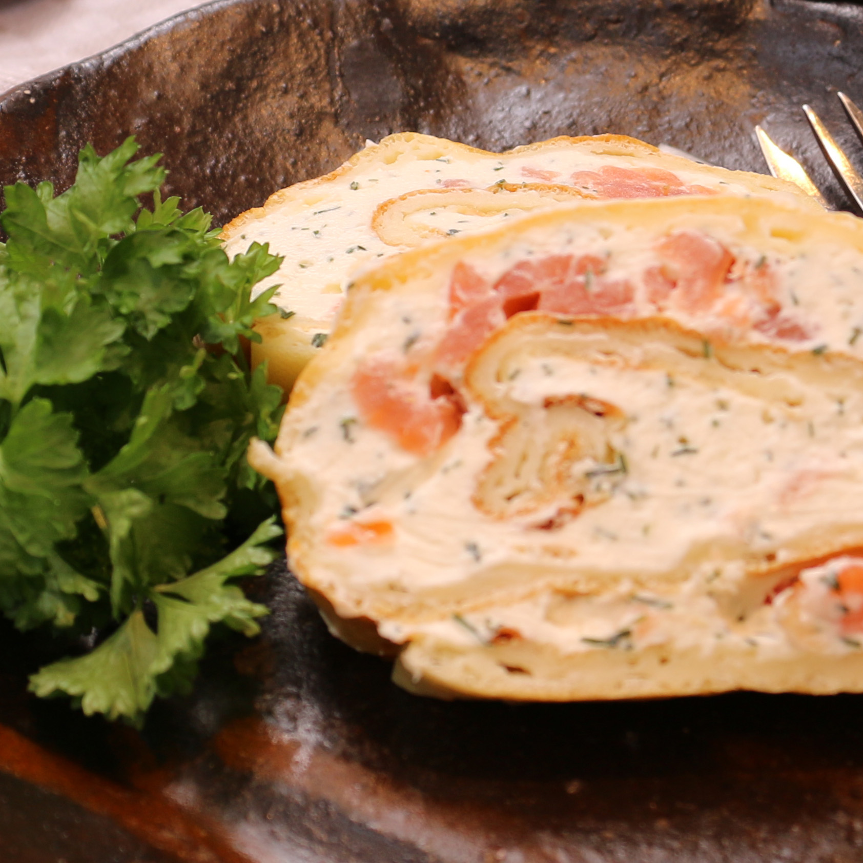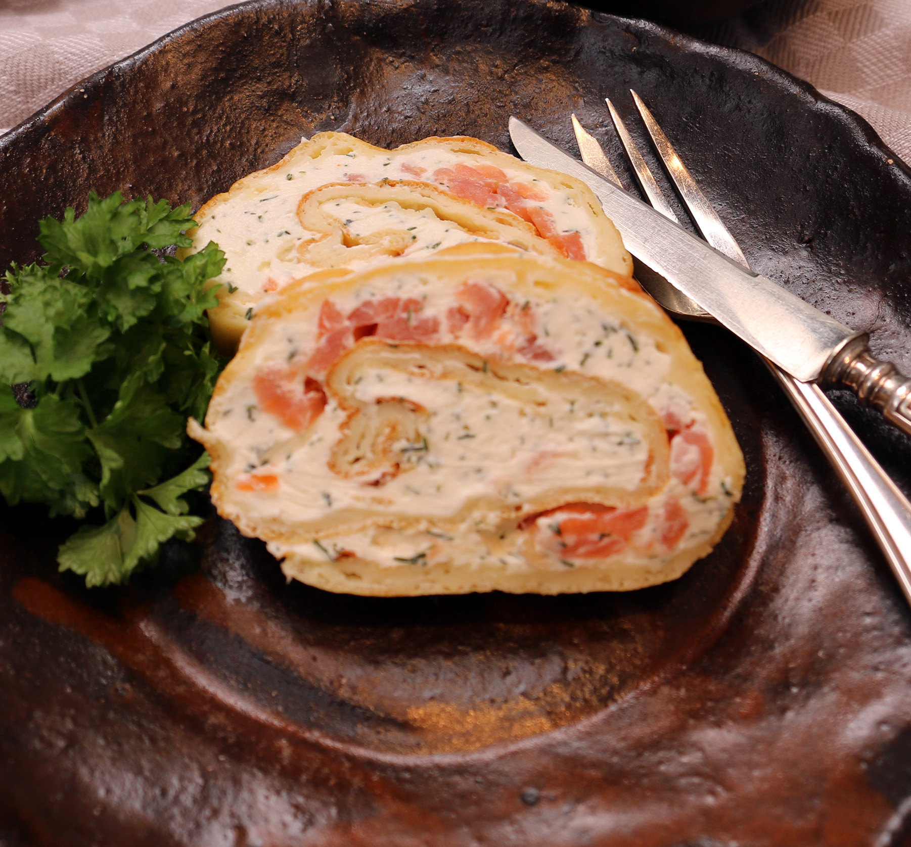 Pfannkuchenroulade mit Lachs-Frischkäsefüllung