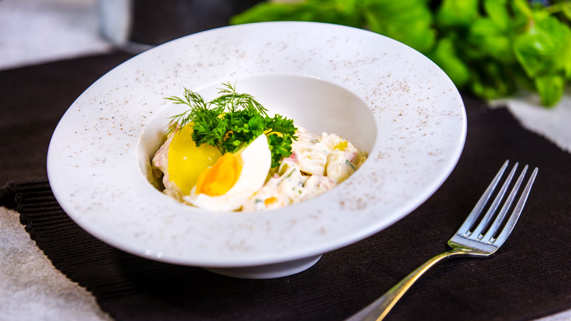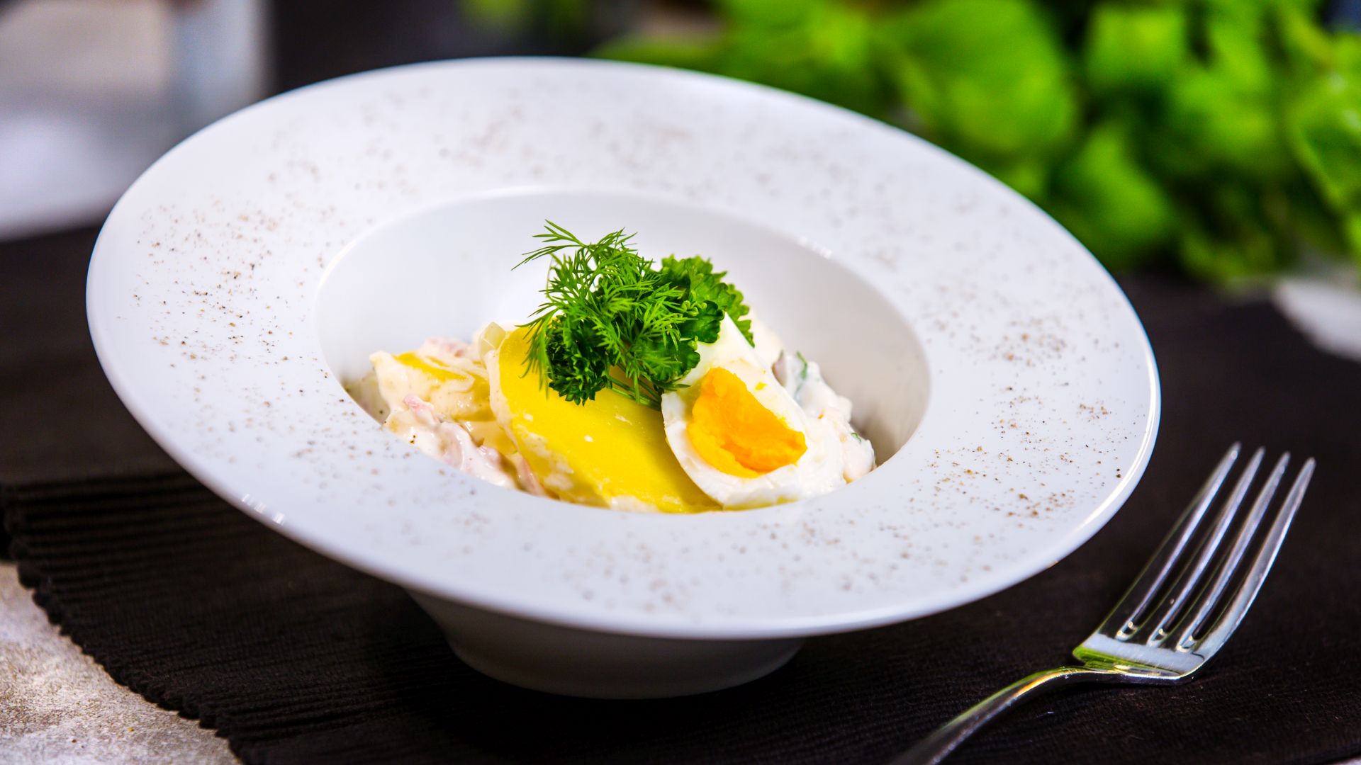• Vor dem Servieren das fünfte Ei achteln und auf dem fertigen Salat dekorativ anrichten. Mit gehackter Petersilie und klein geschnittenem Schnittlauch servieren.