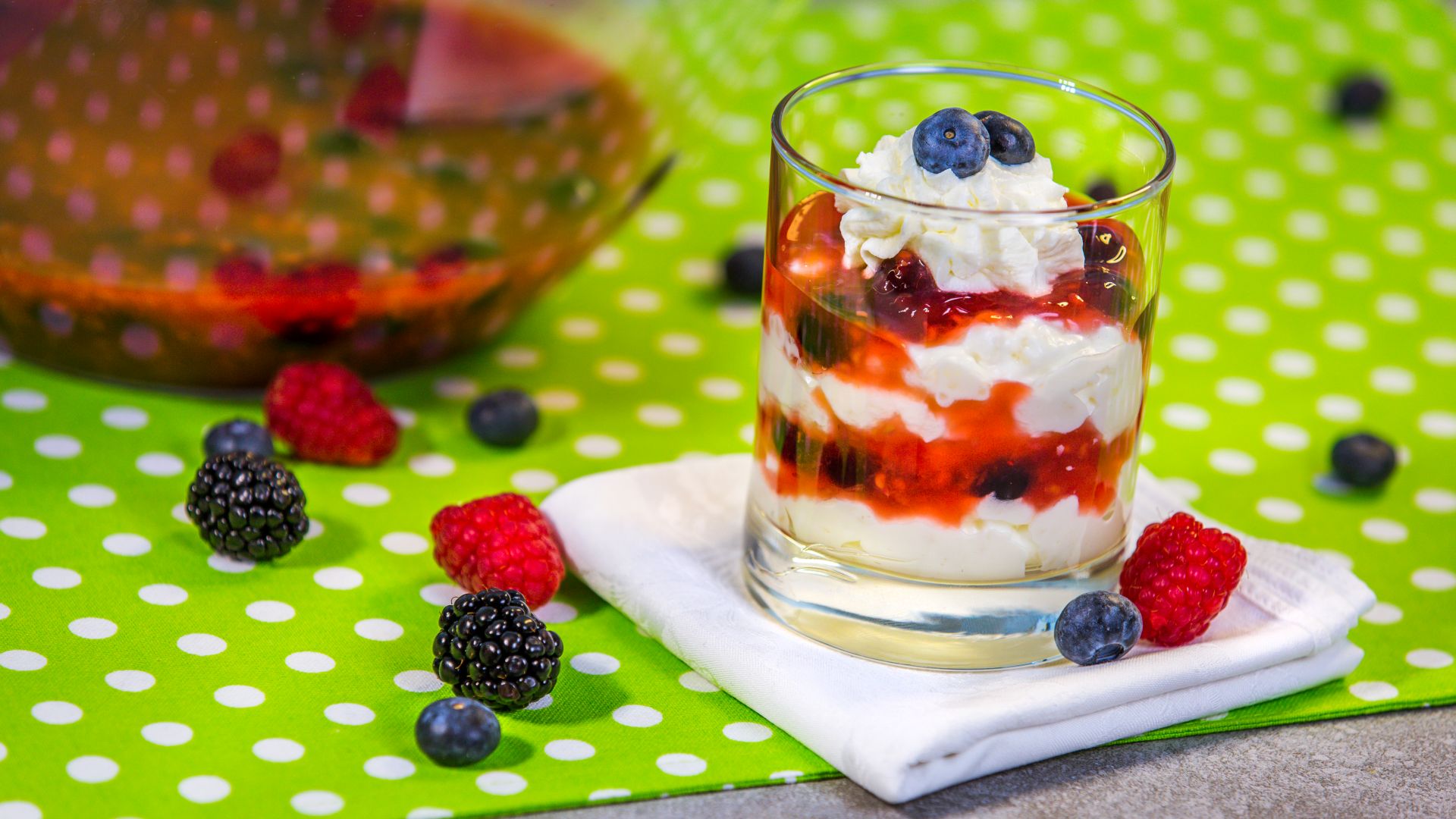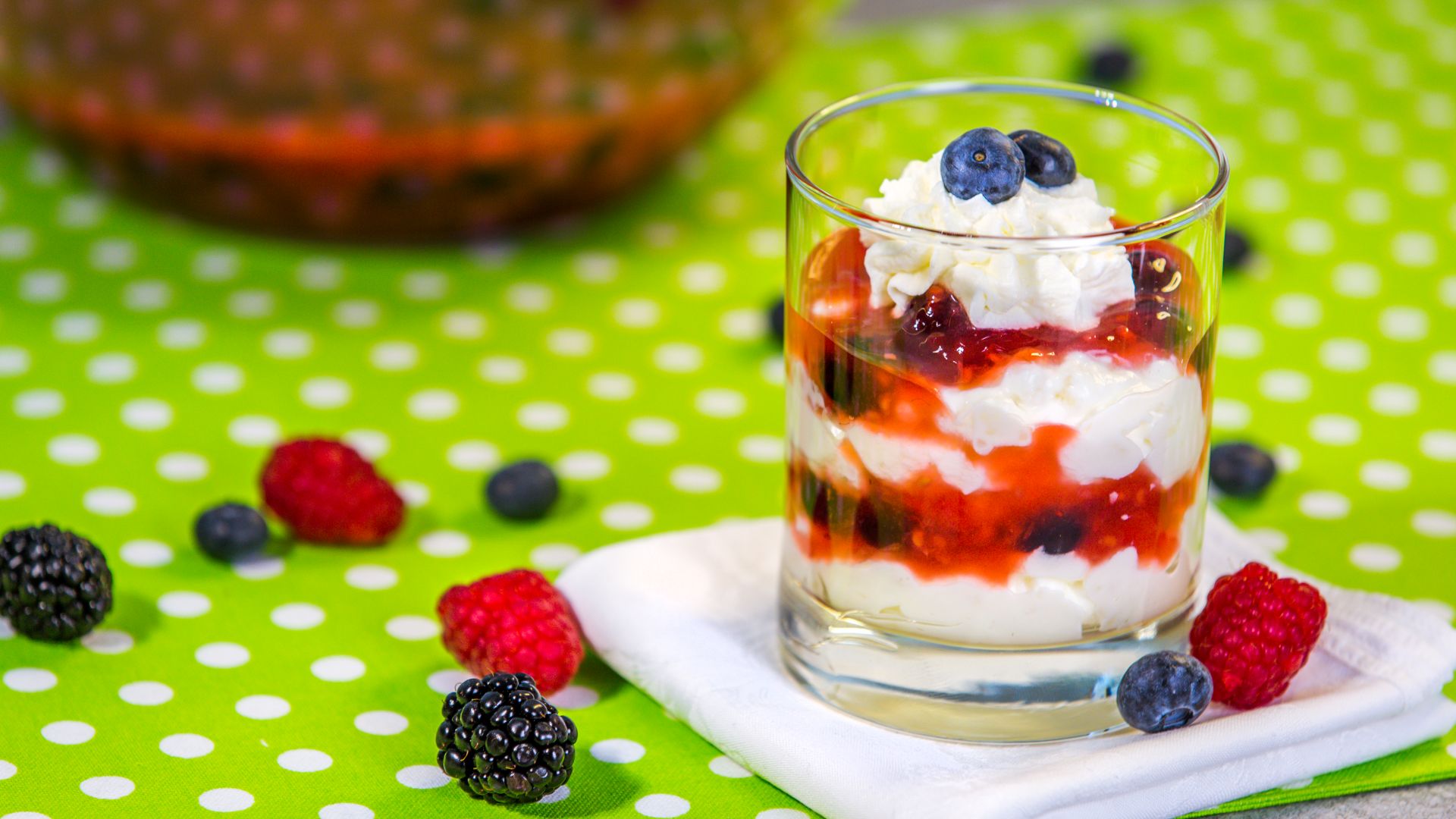 Den Milchreis abwechselnd mit Kompott, roter Grütze oder anderem Obst in eine Glasschüssel schichten und mit Früchten garnieren.