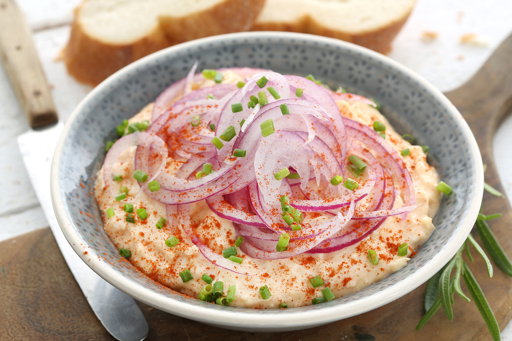 - Käseaufstrich in Schälchen füllen und mit den Zwiebelringen und Schnittlauchröllchen bestreut servieren. Dazu schmeckt ein rustikales Landbrot oder Baguette.