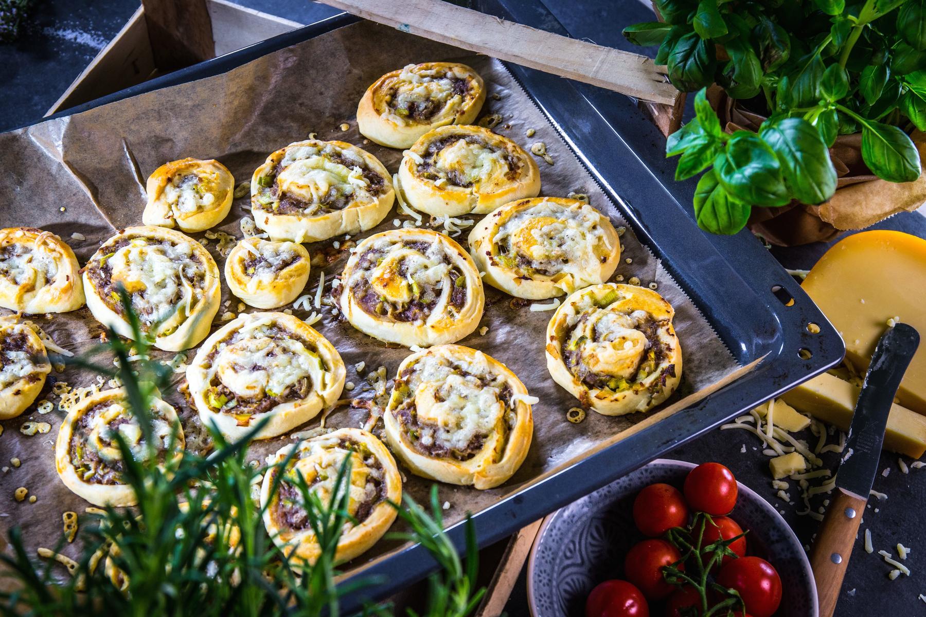 - Den Hefeteig ausrollen, die Hackfleischmasse gleichmäßig darauf verstreichen und die Teigplatte zu einer Rolle aufrollen. Diese Rolle in ca. 1,5 cm dicke Scheiben schneiden, auf ein mit Backpapier ausgelegtes Backblech setzen, mit verquirltem Ei bestreichen und im vorgeheizten Backofen bei 200°C ca. 20 Minuten backen.
