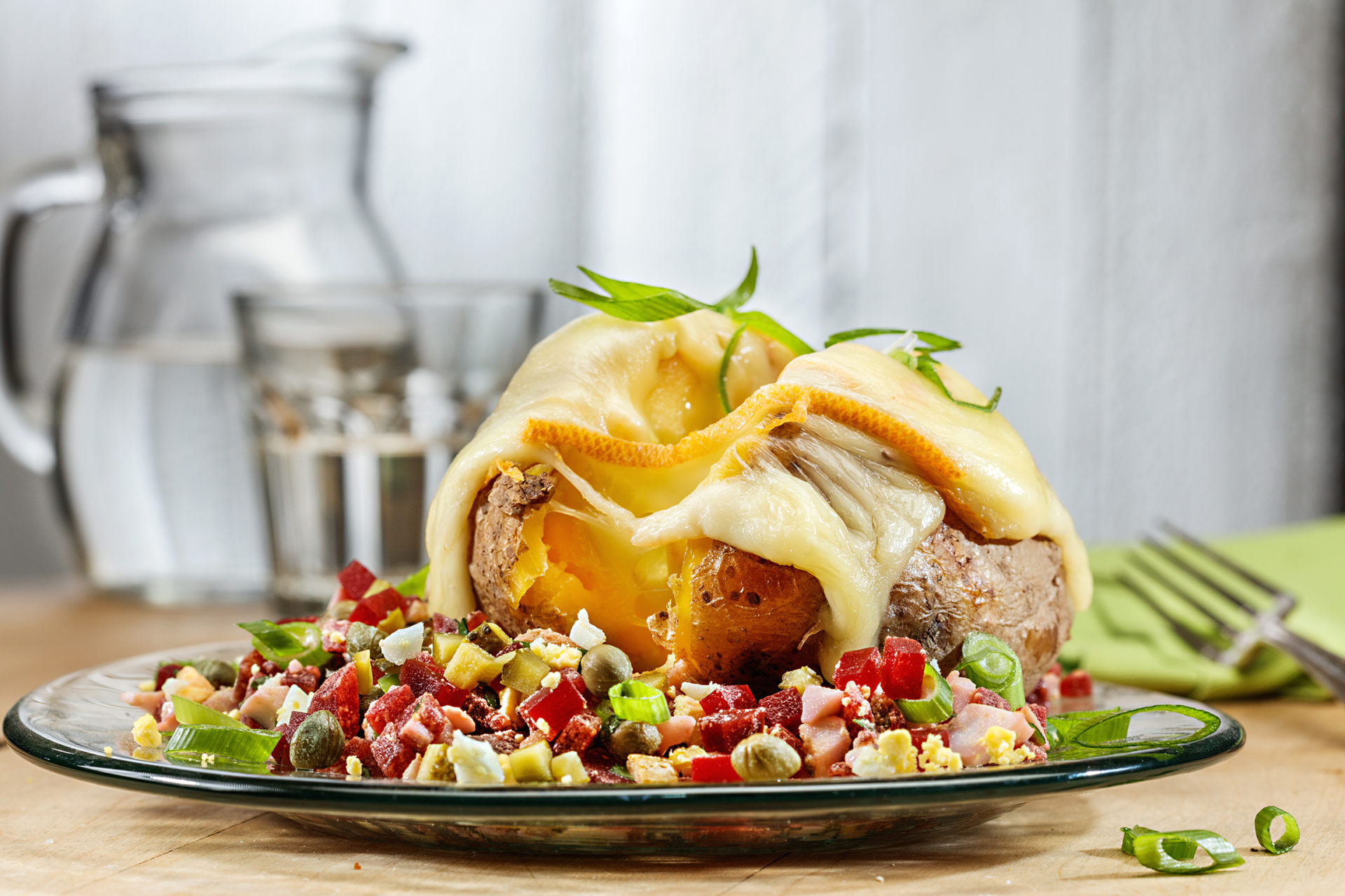 - Kartoffeln der Länge nach einschneiden und jeweils mit ca. 10 g Butter füllen und salzen.