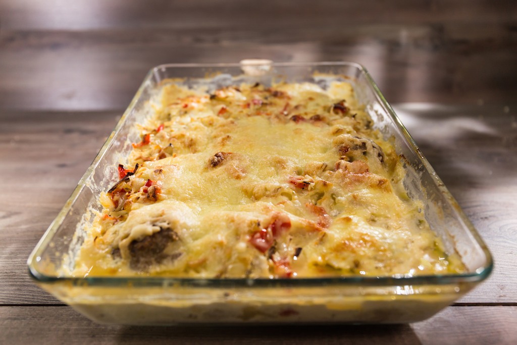 - Diese in einer beschichteten Pfanne in Öl braten und in eine Auflaufform legen.