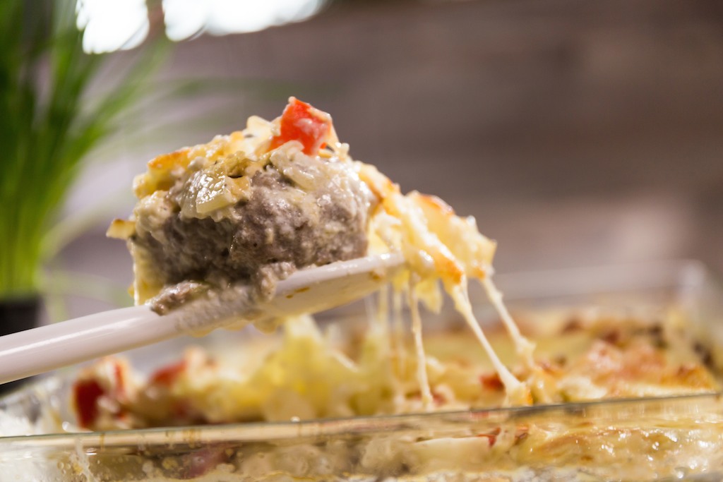 - Die restlichen Zwiebeln schälen, klein hacken, in einer Pfanne andünsten und ebenfalls über die Frikadellen geben.