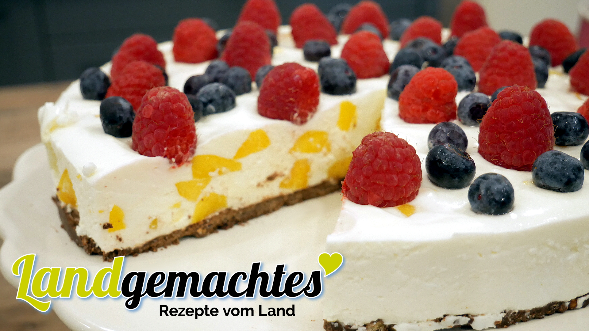 No-bake-Mangoquarkkuchen mit Schokoboden