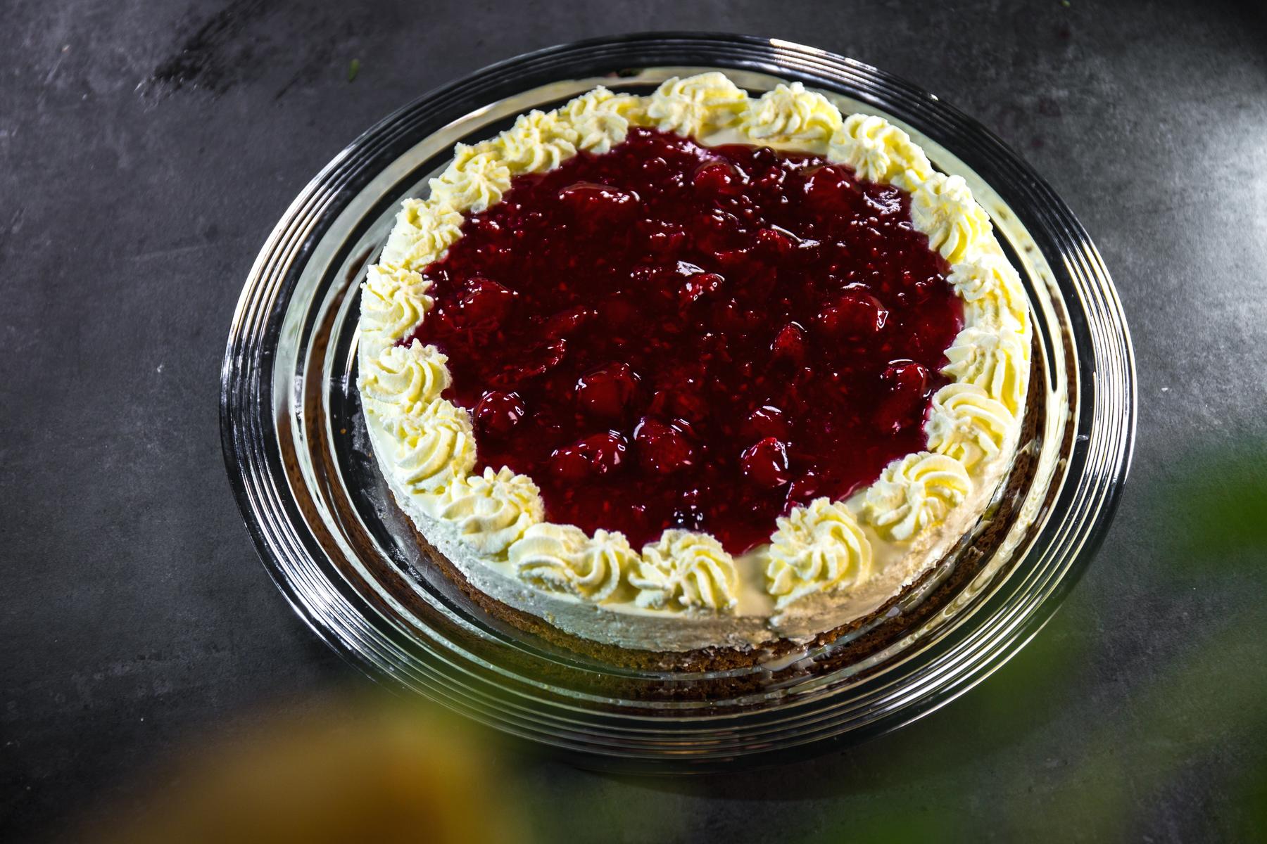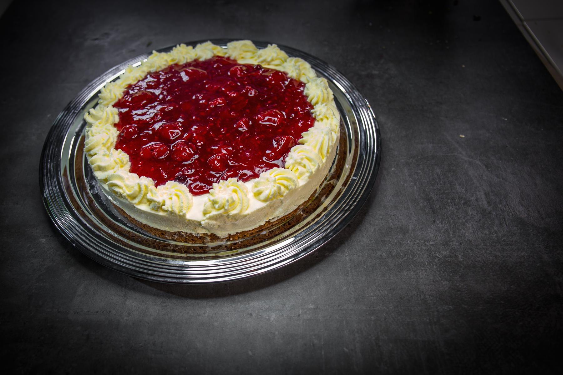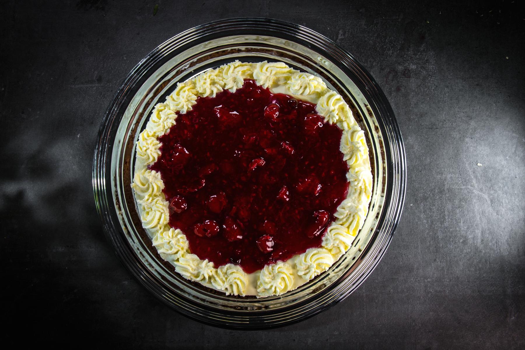 - Die Rote Grütze innerhalb des Sahnerandes verteilen.