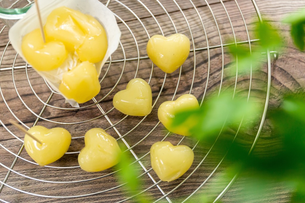 Wer Eiswürfelbehälter aus Silikon hat, kann die Masse auch in den kleinen Förmchen ausgießen und wenn sie fest geworden ist einfach hinaus drücken.