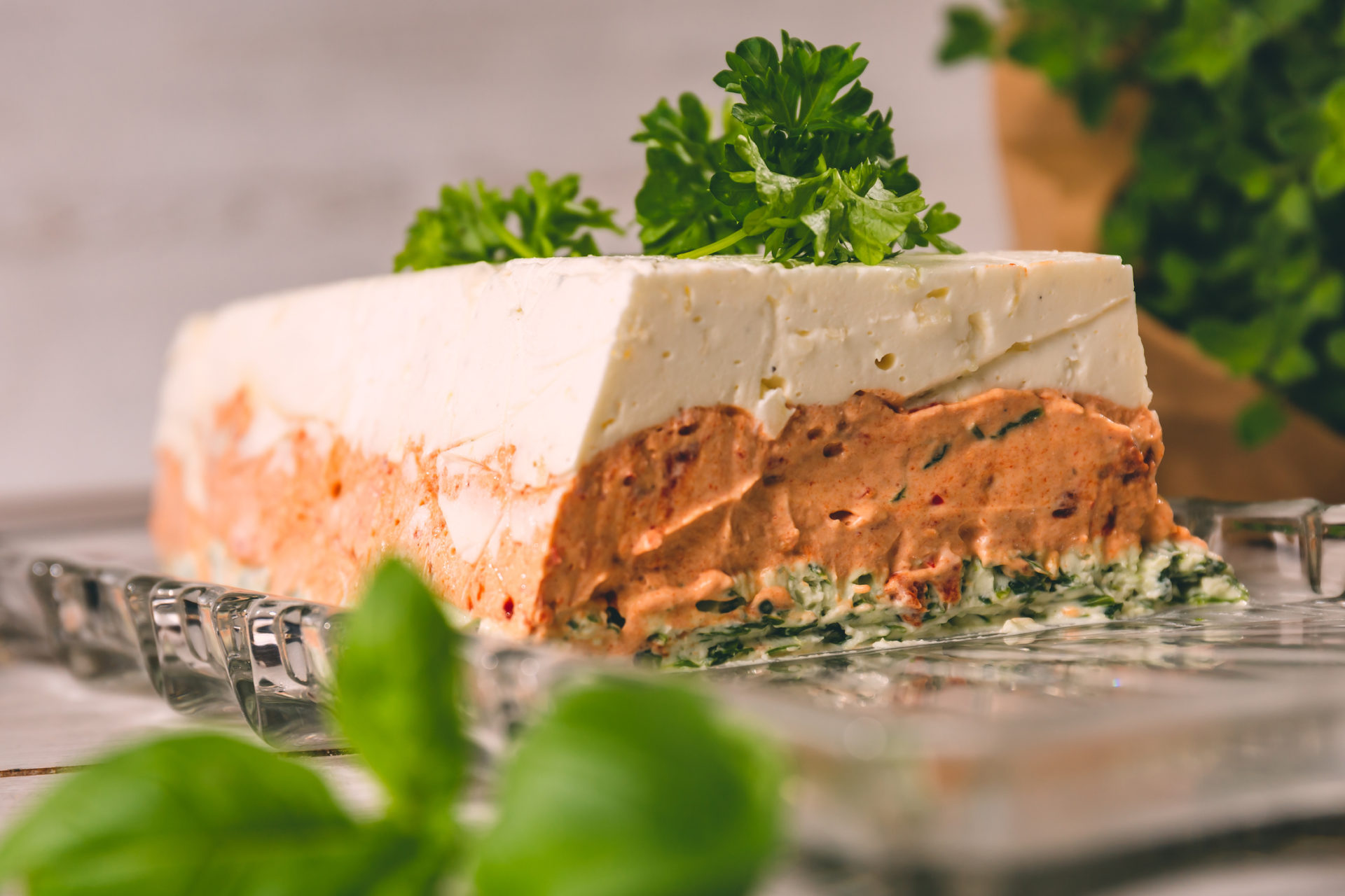 - Die weiße Masse wird zuerst in die Kastenform gegeben, dann folgt die rote Masse und zum Schluss die grüne. Das Ganze dann mindestens drei Stunden im Kühlschrank kalt stellen.