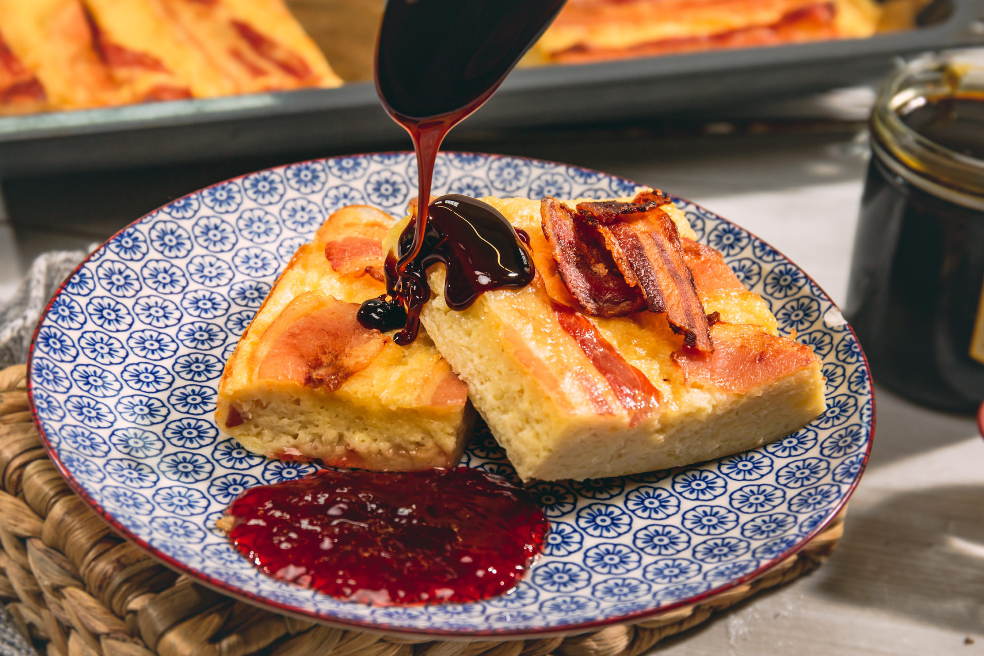 - Den Frühstücksspeck darüber legen und bei ca. 180 °C im Backofen etwa 30 Minuten abbacken.