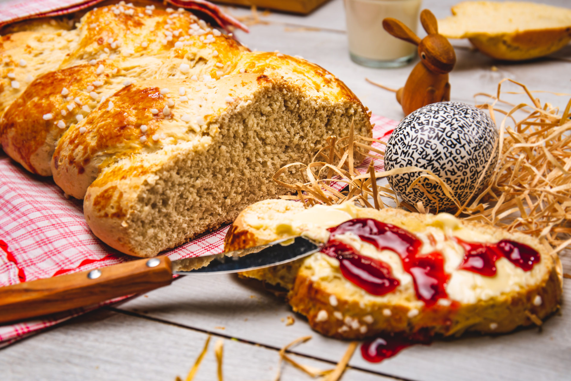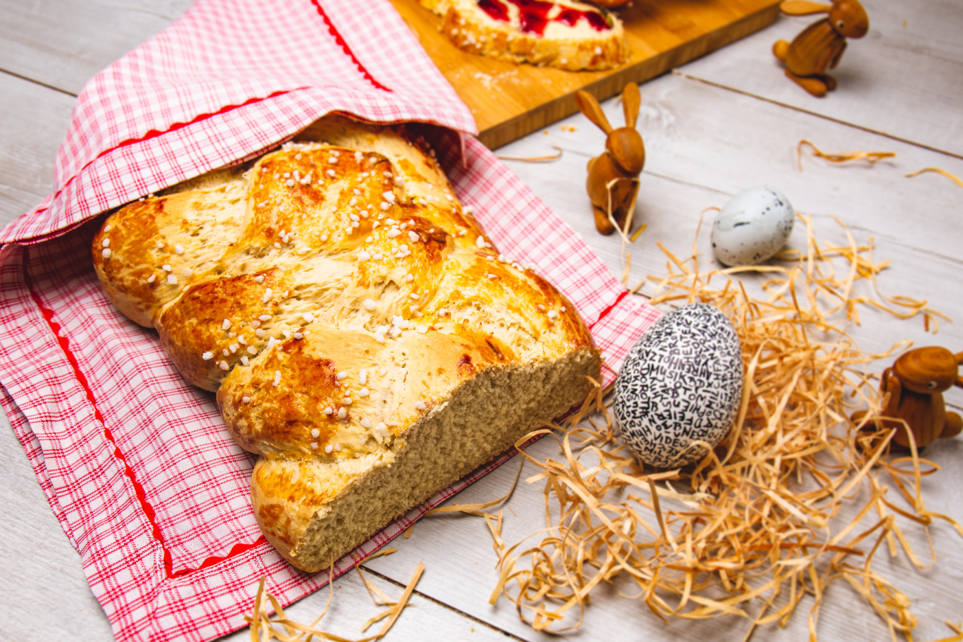 - Diese zu einem Zopf flechten und auf ein Backblech legen.