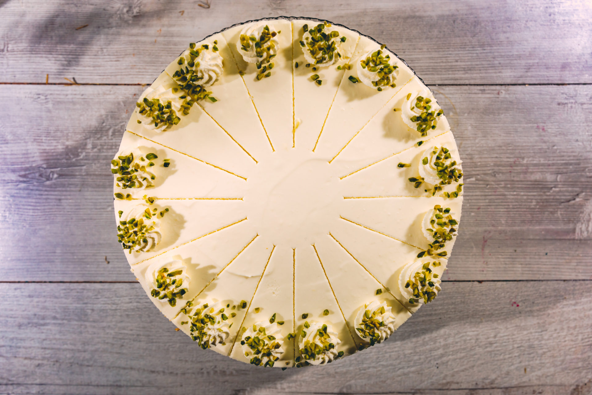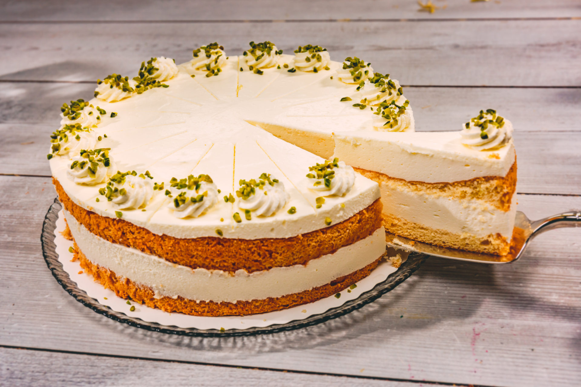 - Die fertige Torte mit geschlagener Sahne und/oder Pistazien verzieren.