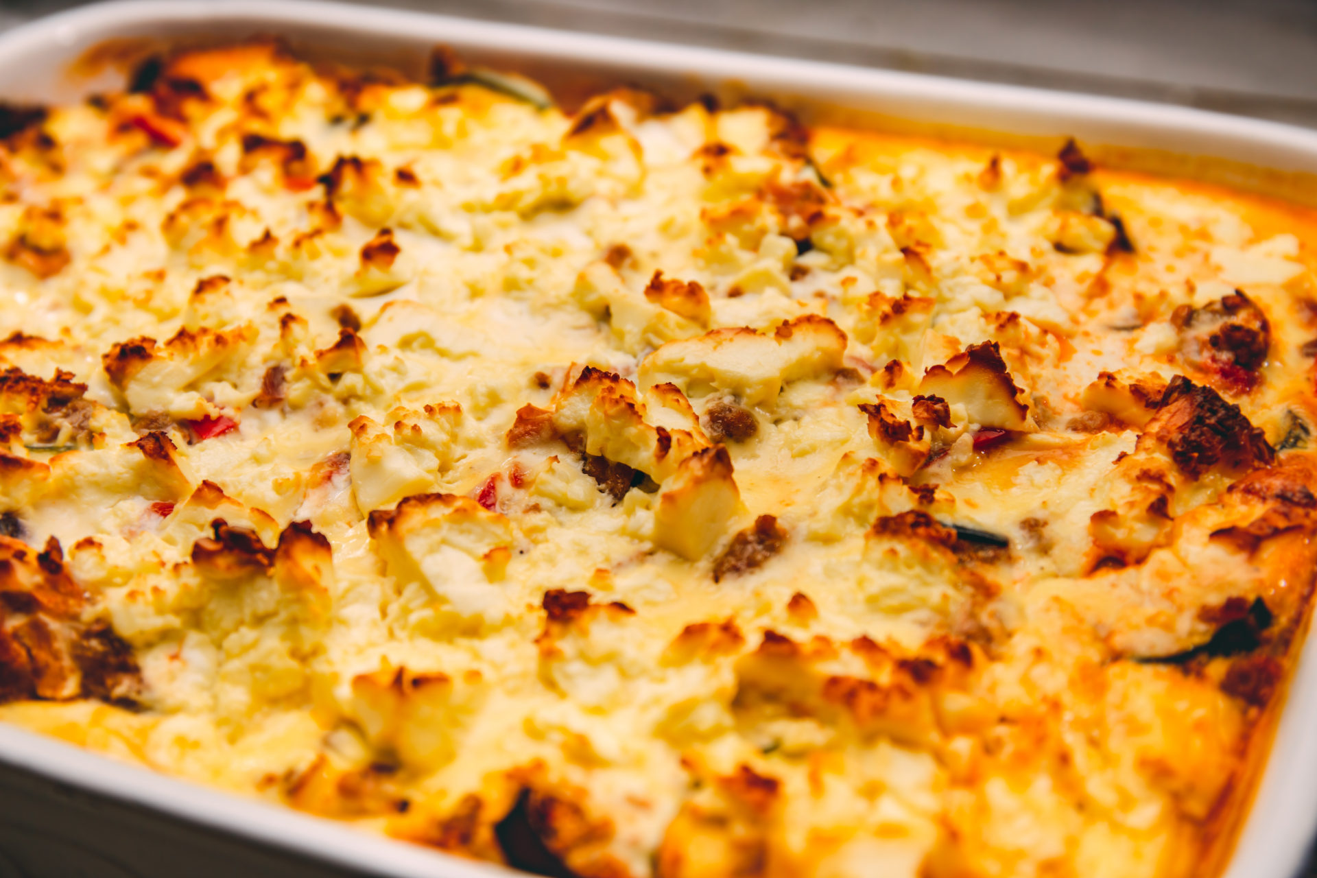- Eier mit Joghurt, Sahne, Salz und Pfeffer verrühren und über den Auflauf geben.
