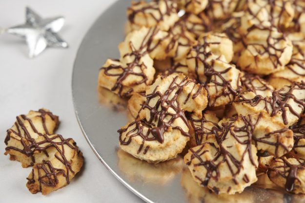 Einen Hauch Orient zaubern die Orangenplätzchen von Leonie auf den Plätzchenteller. Das Spritzgebäck wird mit frisch gepresstem Orangensaft und einer guten Portion Kardamom aromatisiert und nach dem Backen mit Kuvertüre besprenkelt.