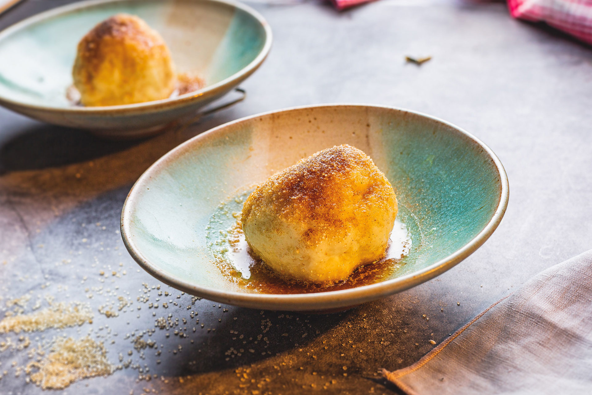 - Die Semmelbrösel mit Zimt & Zucker mischen, über die Knödel streuen und mit geschmolzener, leicht gebräunter Butter begießen.