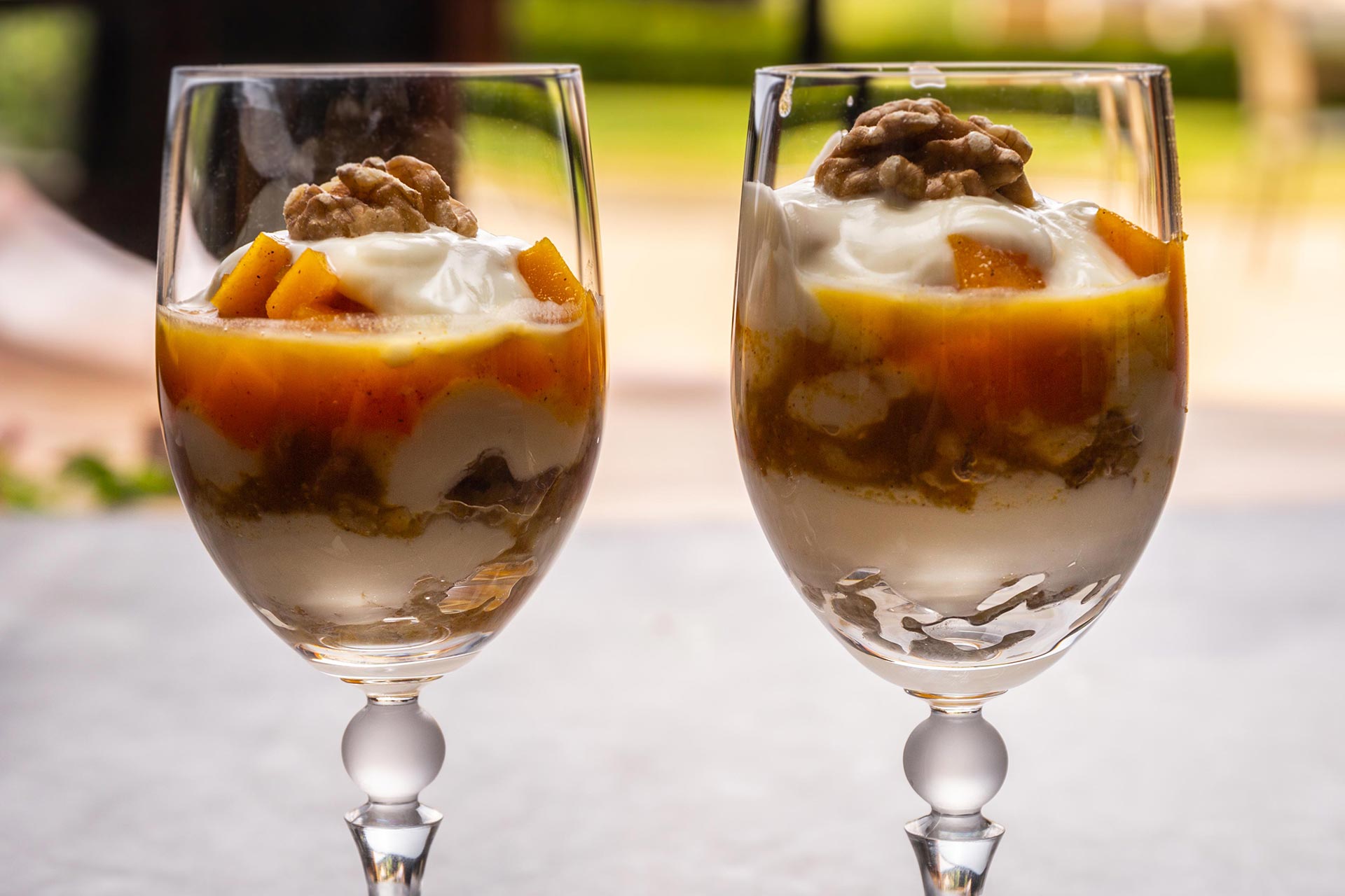 - Zum Anrichten in vier Gläser zuerst eine Schicht gehackte Walnüsse, dann die Schmandcreme, danach die Kürbismasse geben. Der Vorgang kann beliebig oft wiederholt werden, bis die Gläser voll sind. Zum Garnieren einen Walnusskern in jedes Glas geben.
