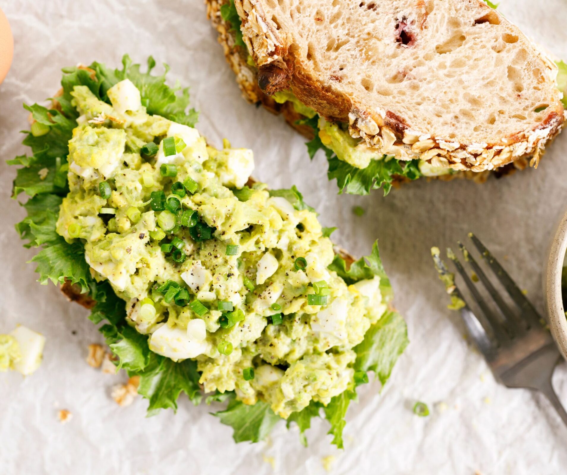 - Avocado-Eiersalat auf die Brotscheiben schmieren. Wer mag kann noch Salat darunter legen.