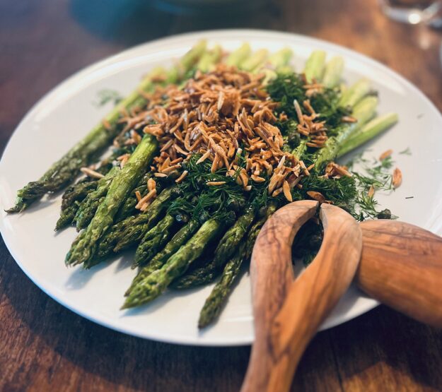 Knuspriger Spargel aus dem Ofen mit Mandeln und Joghurt