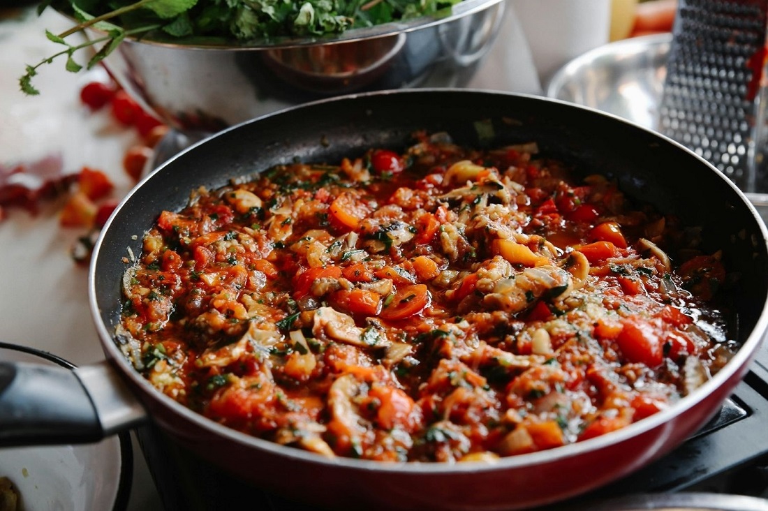 - Öl in einer großen Pfanne erhitzen. Tomaten hineingeben und bei mittlerer Hitze 5–8 Minuten weich braten, bis sie aufplatzen. Anschließend leicht zerdrücken.