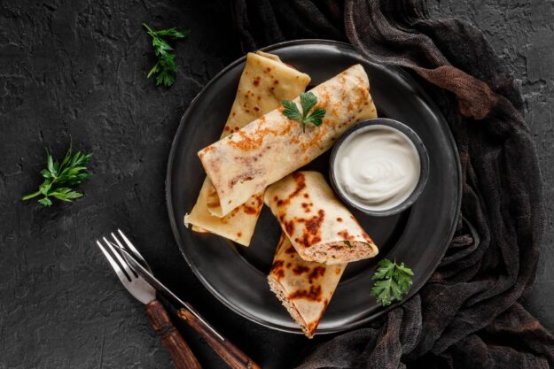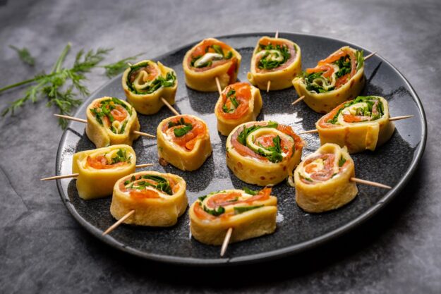 Pfannkuchen gibt es süß und herzhaft, Martina bereitet uns eine feine Variante mit Lachs zu, die auf jedem Buffet beeindruckt. Dank des Frischkäses werden die kleinen Röllchen schön frisch und durch den Rucola kommt Würze ins Spiel.