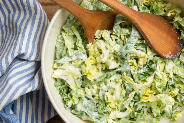 Noch Grillwürstchen eingefroren, die nicht im Eisfach überwintern sollen? Dann hat Martina eine perfekte Beilage dazu. Sie macht aus Spitzkohl einen fruchtig-herzhaften Salat mit einem cremigen Dressing aus Sahne und Crème fraîche.